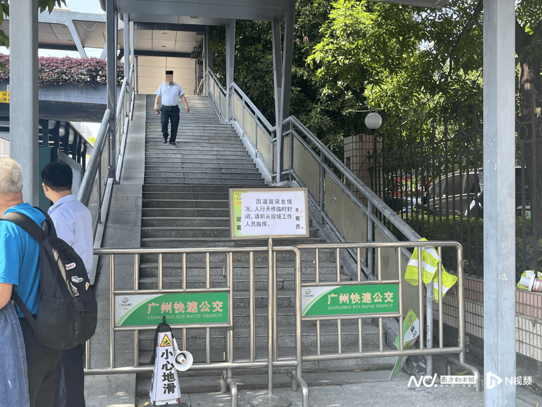 南都记者还注意到, 上天桥的楼梯已经封闭,围栏上写明“因道路突发情况,人行天桥临时封闭,请听从现场工作人员指挥”。