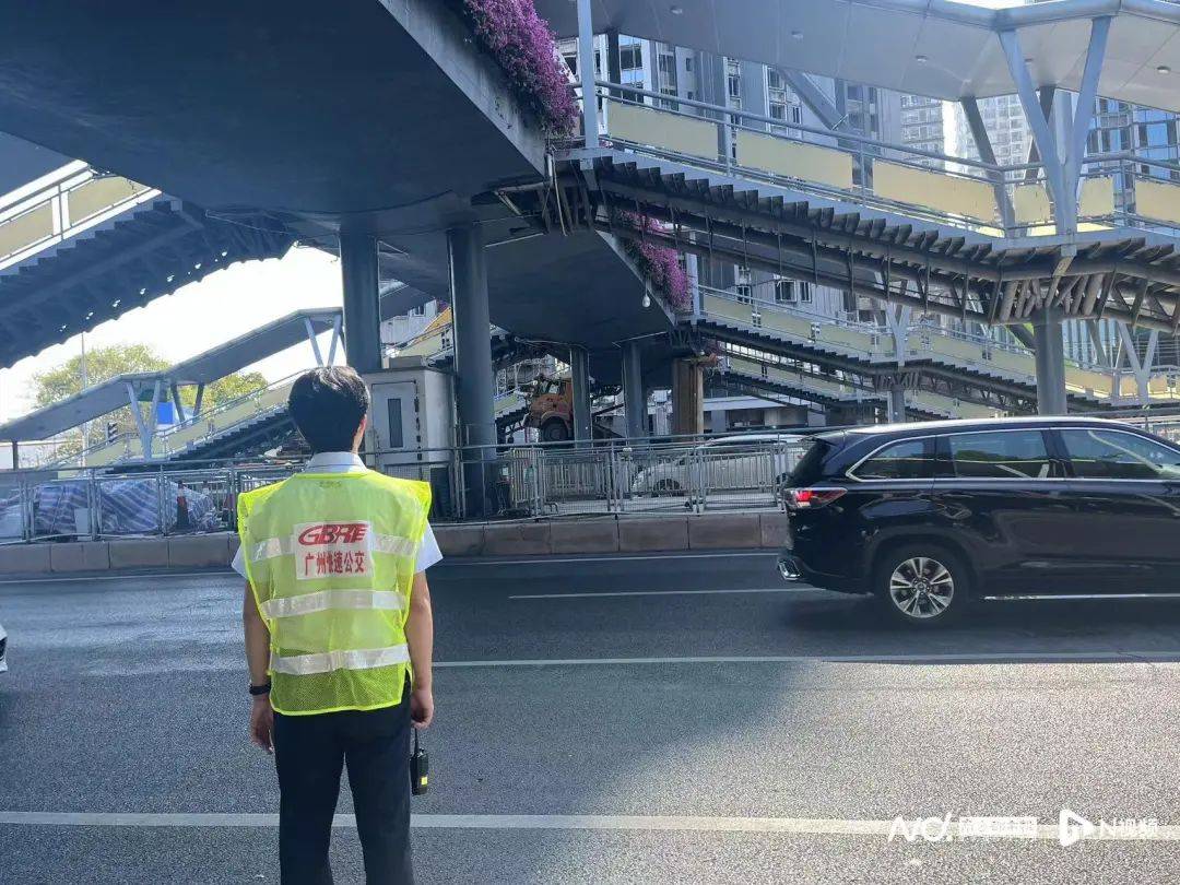 路边另一名身穿标有“广州快速公交”黄马甲的人员告诉南都记者,事故发生在凌晨,泥头车车斗抵住了天桥,“我们负责在这里维持秩序”。