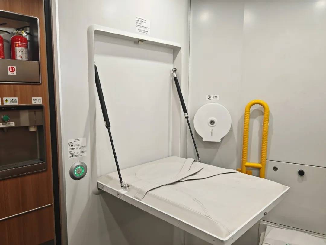 列车中部的无障碍卫生间设有婴儿护理台,方便旅客为小宝宝更换尿布。