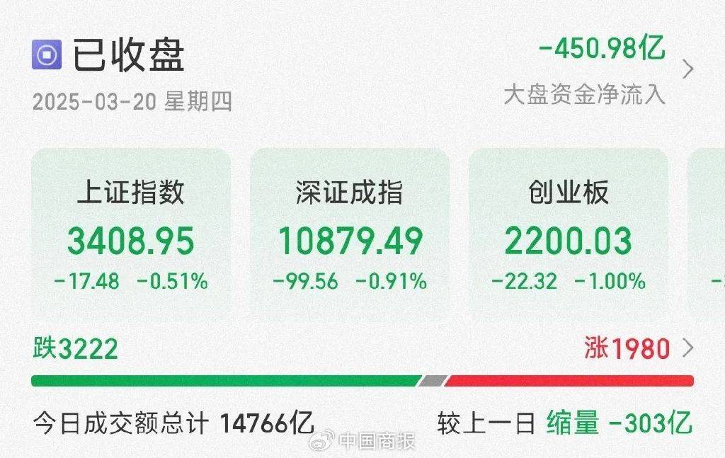 中国商报(记者 马文博)3月20日,A股三大指数继续下跌。截至收盘,沪指跌0.51%,深成指跌0.91%,创业板指跌1%,北证50指数跌2.74%。全市场成交14766亿元,较上一日缩量303亿元。全市场超3200只个股下跌。