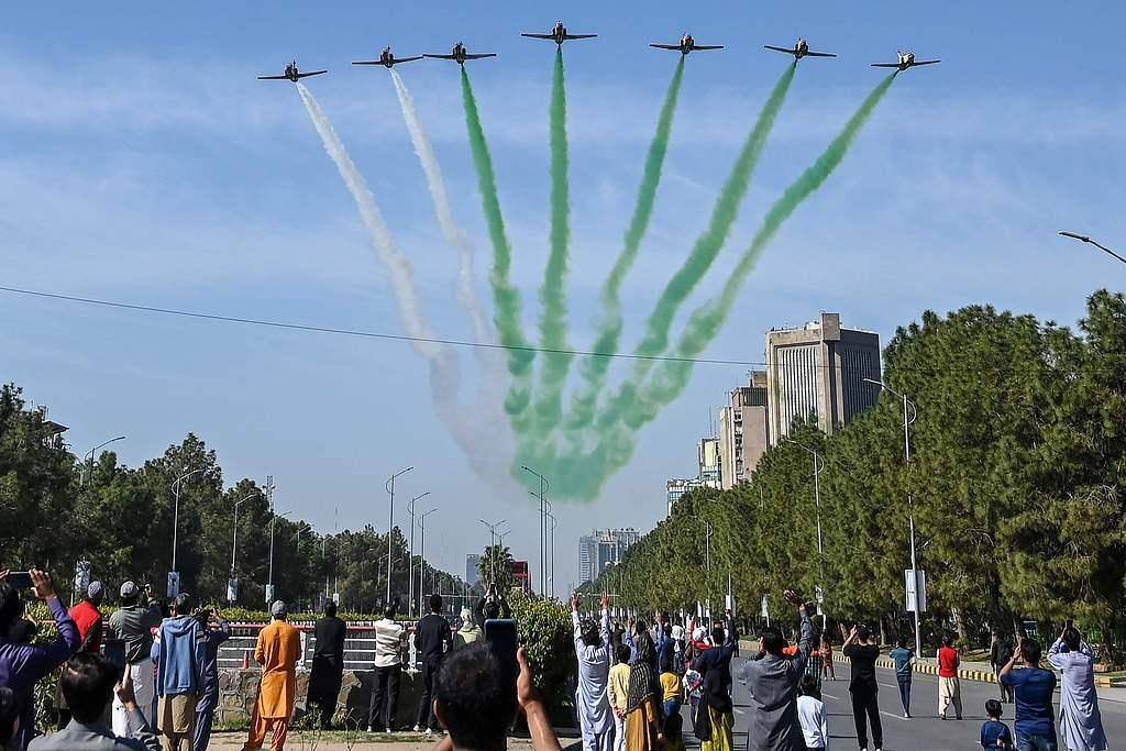 3月23日,伊斯兰堡,在巴基斯坦国庆阅兵期间,巴空军在总统府上空表演特技飞行。图源:视觉中国