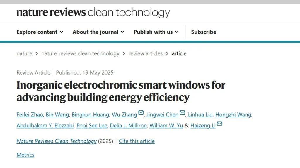 5月19日,《Nature Reviews Clean Technology》最新一期刊发了一篇题为 “Inorganic electrochromic smart windows for advancing building energy efficiency” 的综述文章。