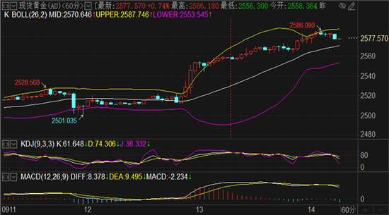 周五黄金价格的回撤力度并不明显,周四美盘到周五上涨了58个点,最终收报2578一线,整周涨幅+3.27%。见证国际黄金价格刷新历年新高来到2585.9一线。截止收盘来看,1小时图形上涨量能减弱,MACD快慢线死叉,绿色量能柱转变为放量阶段,KDJ随机指标高位结死叉向下运行,4小时图形中附图指标MACD和KDJ上涨量能也是出于缩量阶段,这表明短线周期还会有回撤的空间。下周一开盘可以参考周线和日线的MACD量能来定住基调,还是那句话,高位防守做空只有多次试错才能确定顶部。