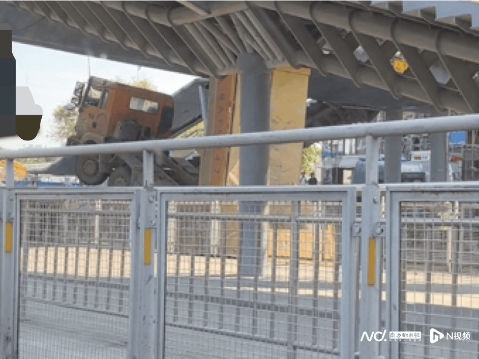 当日中午,南都记者来到事发现场看到, 泥头车车斗一端仍卡在天桥下方。