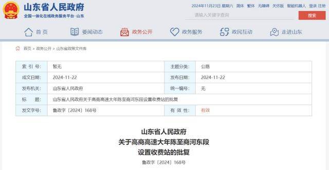 近日,山东省政府网站发布《山东省人民政府关于高商高速大年陈至商河东段设置收费站的批复》——