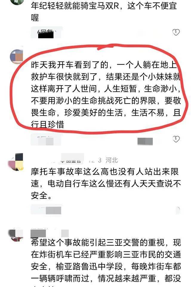 4日,三亚市公安局交通警察支队工作人员告诉记者,“人已经确定过世了。”该工作人员还称,事故属于意外,女骑手当时因避让车辆,导致摔车。其遗体已送殡仪馆,家属也在赶往三亚的路上。