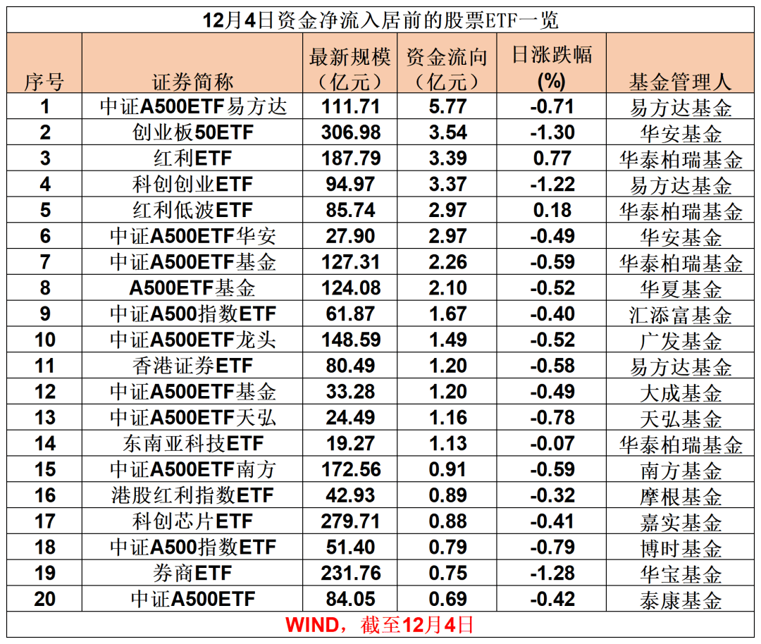 12月4日,10多只中证A500ETF“霸屏”资金净流入排行榜。另外,创业板50ETF、红利ETF、科创创业ETF等也成吸金主力。