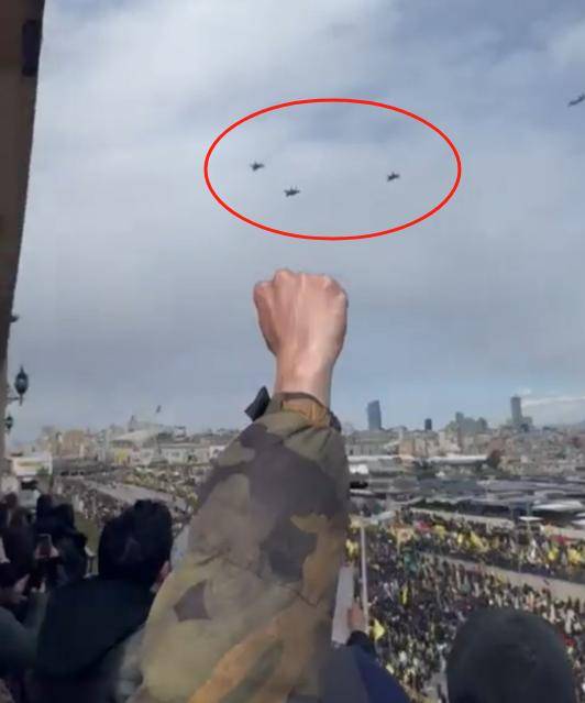 当天,数十万怀着痛苦与愤怒的黎巴嫩人聚集在这里,就在纳斯鲁拉与萨菲丁遗体前往安葬地途中,以色列空军的F-15I和F-35I战机忽然从天空划过,全程都没有拉音爆,以令人难以置信的超低空飞行进行示威,现场几十万民众怒火被瞬间点燃,高举拳头宣泄心中恨意。