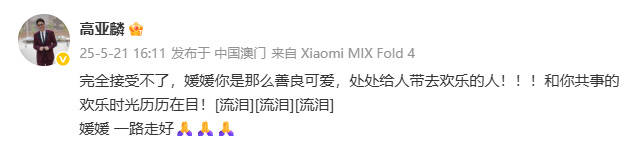 当天,《家有儿女》“夏东海”演员高亚麟发文悼念朱媛媛:“完全接受不了,媛媛你是那么善良可爱,处处给人带去欢乐的人!!!和你共事的欢乐时光历历在目!媛媛,一路走好!”